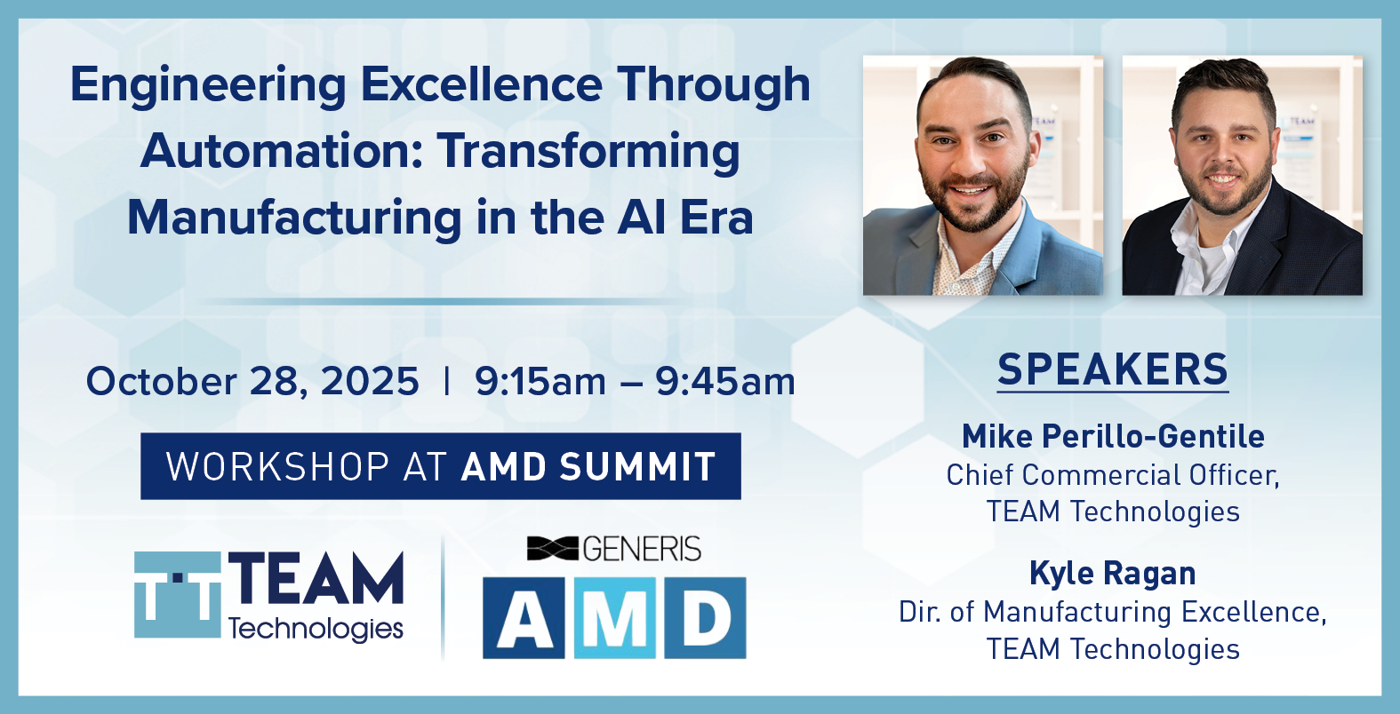 Engineering Excellence Through Automation: Transforming Manufacturing in the AI Era TEAM Technologies will host a workshop at the AMD Summit October 28 at 9:15 a.m. Chief Commercial Officer, Mike Perillo-Gentile, and Director of Manufacturing Excellence, Kyle Ragan, will be guiding […]